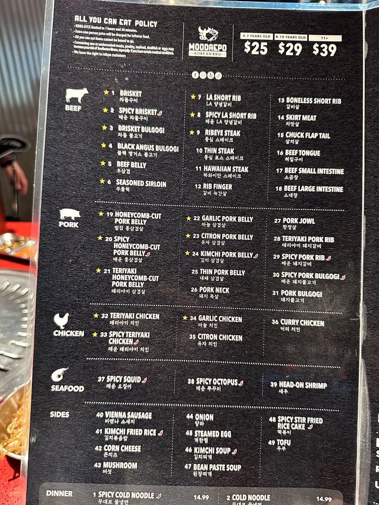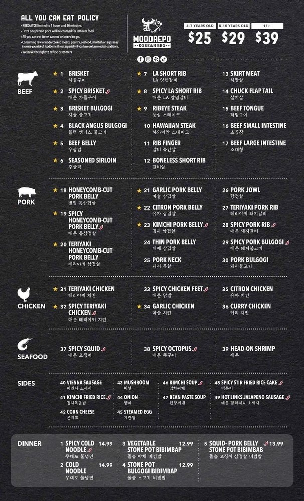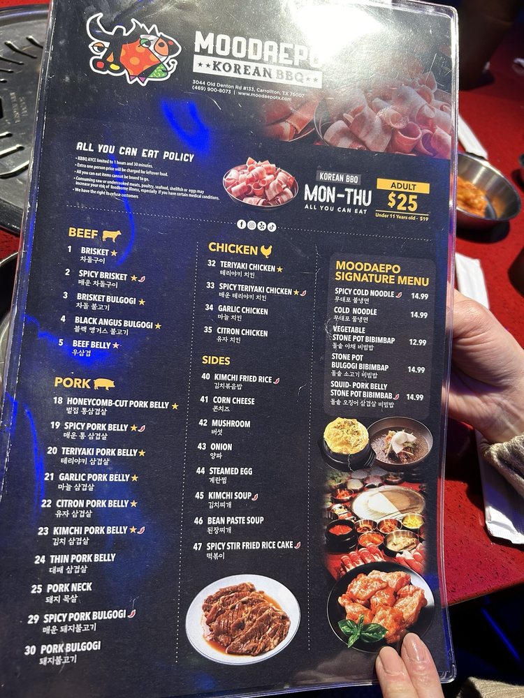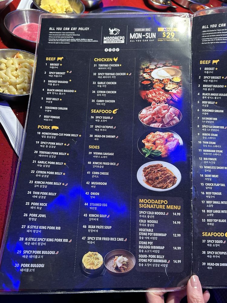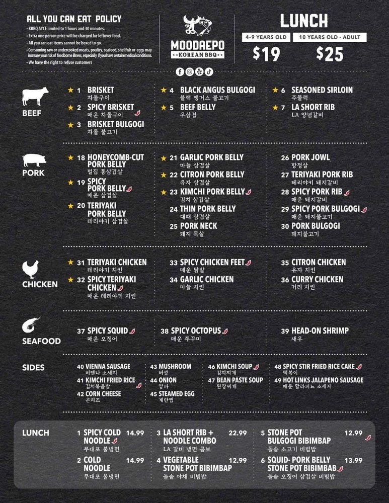 Introducing the menu at Moodaepo Korean BBQ: Located in Carrollton, TX, this casual yet trendy spot offers robust flavors and generous portions. Known for its all-you-can-eat Korean BBQ, Moodaepo impresses with high-quality cuts of meat, including unlimited short rib/kalbi options. Customers rave about the quick service and diverse menu offerings, with favorites like spicy king rib and beef tongue. The ramen bar adds a unique touch, allowing diners to customize their own noodles. The ambiance is lively, with games and entertainment options. While some reviewers note inconsistencies with side dishes, the standout dishes like malnourished and the interactive ramen station make up for any shortcomings. Overall, Moodaepo stands out as a top choice for Korean BBQ, combining excellent food, fun atmosphere, and attentive service.